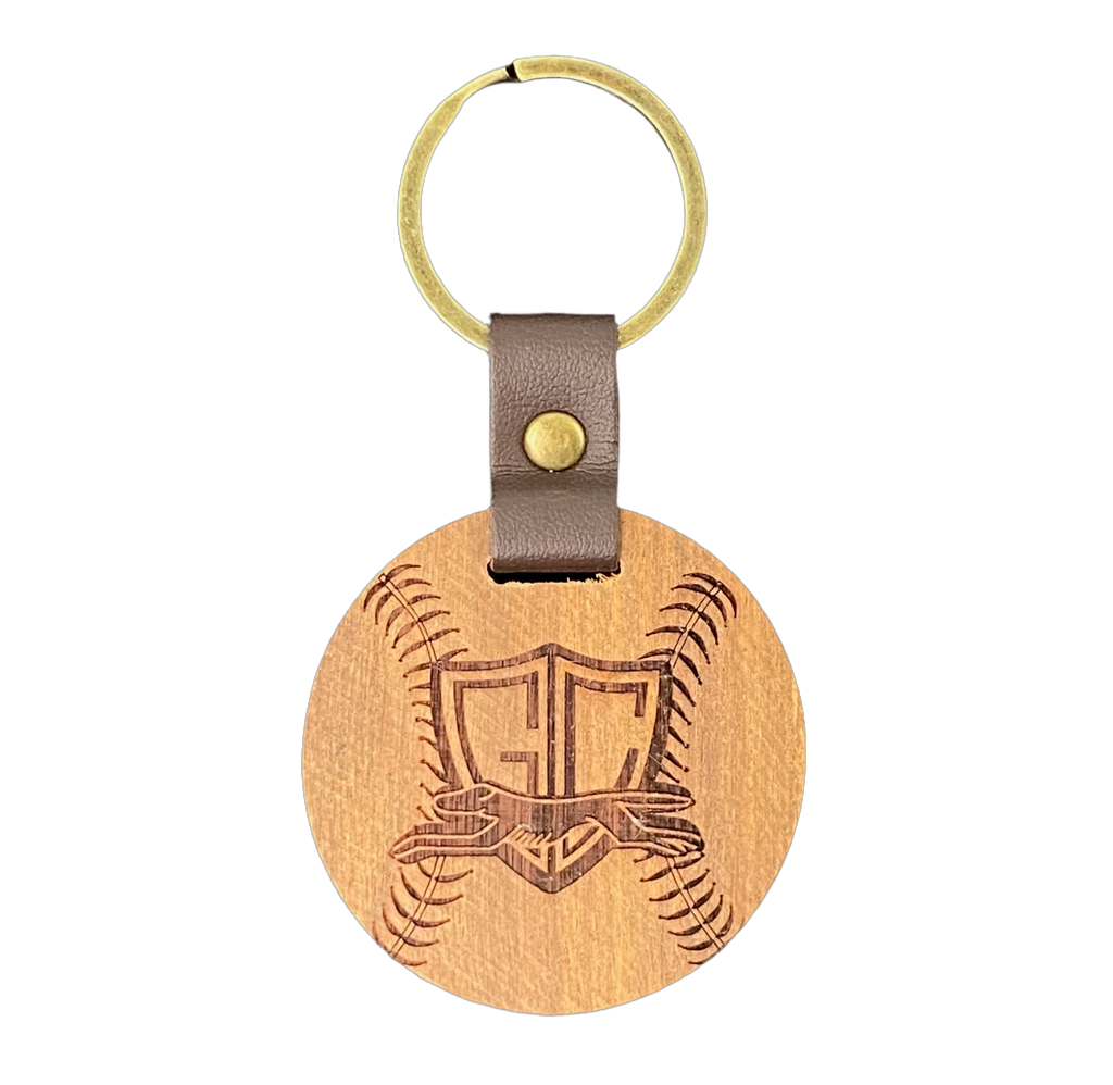 A round keychain with baseball "stitching" and the Grove City Greyhounds shield. Walnut and Vegan Leather.